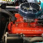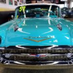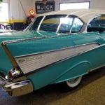 This 57 Bel Air comes equipped with 283 V8 Power Pack engine, power glide automatic transmission, rear fender mount antennas, spinner wheel discs, am push button radio and clock.